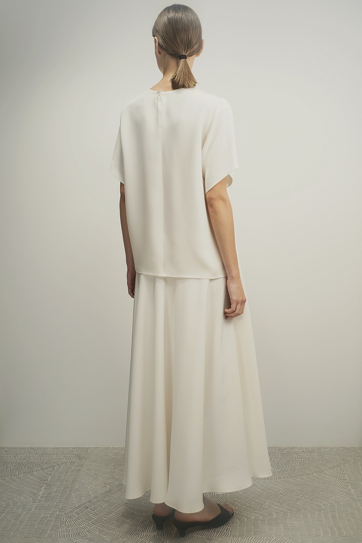 Футболка из плотного итальянского шелка кади с элегантной застежкой-пуговицей на спине. Свободный прямой крой со скругленной линией выреза.
