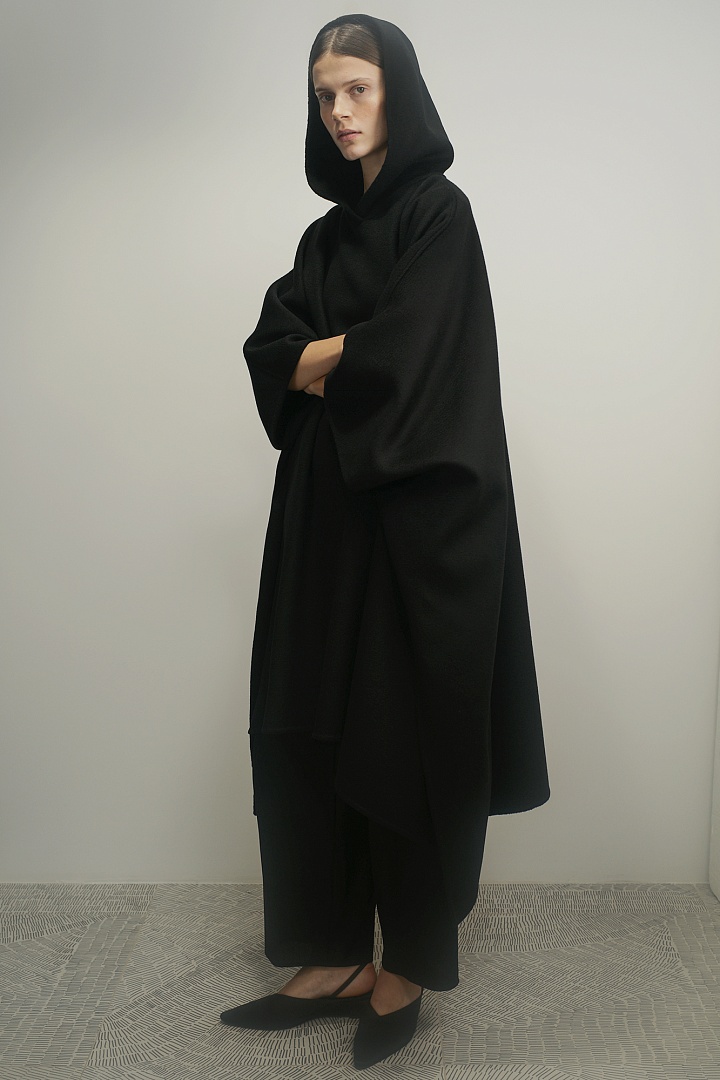 Пальто-кейп из мягкого черного кашемира выполнено в объёмном, обволакивающем силуэте. Изделие окутывает фигуру и легко надевается поверх всего — от структурных костюмов и уютных трикотажных изделий до спокойных повседневных образов. Свободный капюшон добавляет ощущение защищённости и продуман для ветреных дней, сохраняя чистоту линий.