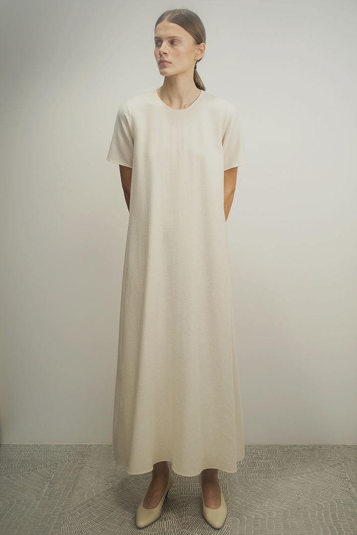 Фактурное платье А-силуэта в длине миди в сливочном оттенке. Лаконичный крой дополнен скрытой молнией на спине. Изделие выполнено из смеси органического хлопка, мягкого кашемира и шелка, создавая тактильно приятные ощущения.