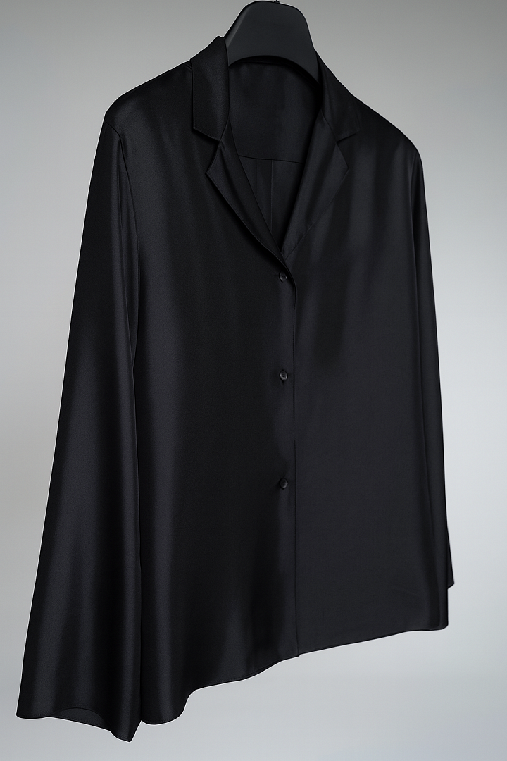 Рубашка свободного кроя из шелкового твила в черном оттенке. Расслабленный свободный силуэт изделия идеально подходит для отпуска. Изделие является частью комплекта и дополняется шортами Ellson.