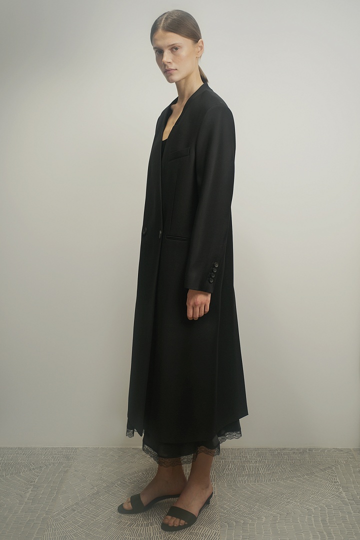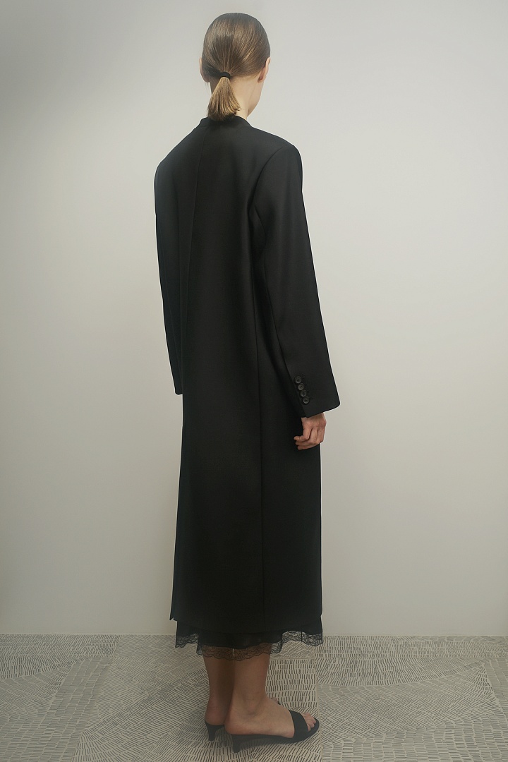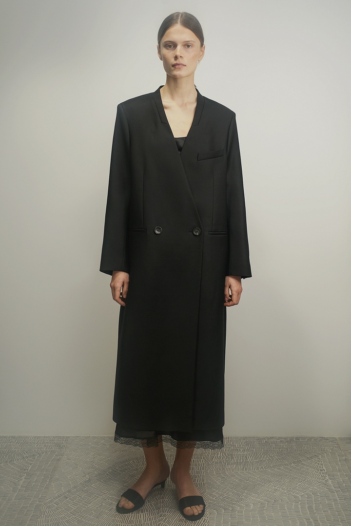 Двубортное пальто из гладкой шерсти без лацканов в длине макси. Прямая модель с прорезными карманами, роговыми пуговицами на рукавах и шлицей сзади.