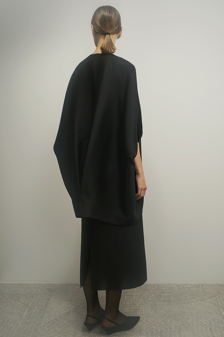 Объёмные рукава с горизонтальными прорезями для рук — тонкая цитата архивных конструкций, переосмысленная в современном минималистичном ключе.