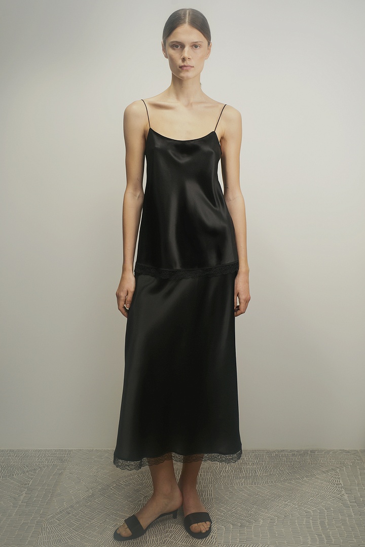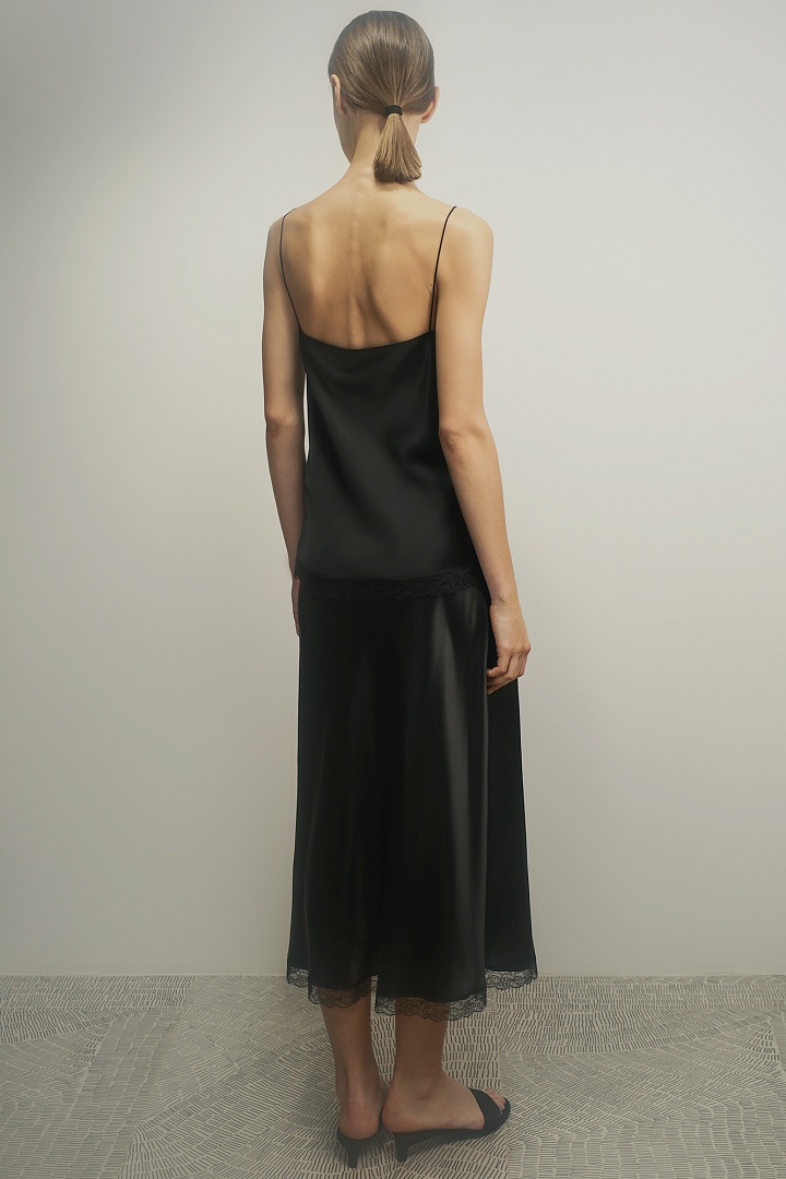 Юбка, скроенная по косой, из атласного шелка на резинке в черном цвете. Деликатное французское кружево выступает тонким акцентом, подчеркивая изящество линии. Модель легко интегрируется в гардероб — от вечерних комплектов до спокойных повседневных сочетаний. Юбка является частью комплекта с топом Soleia.