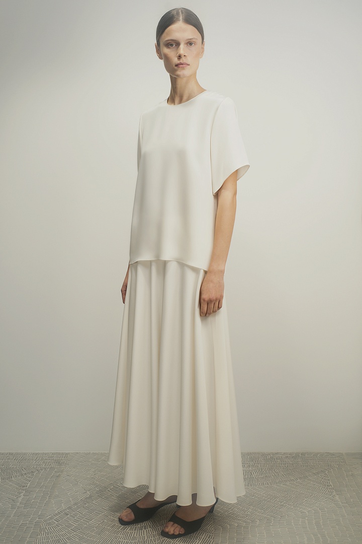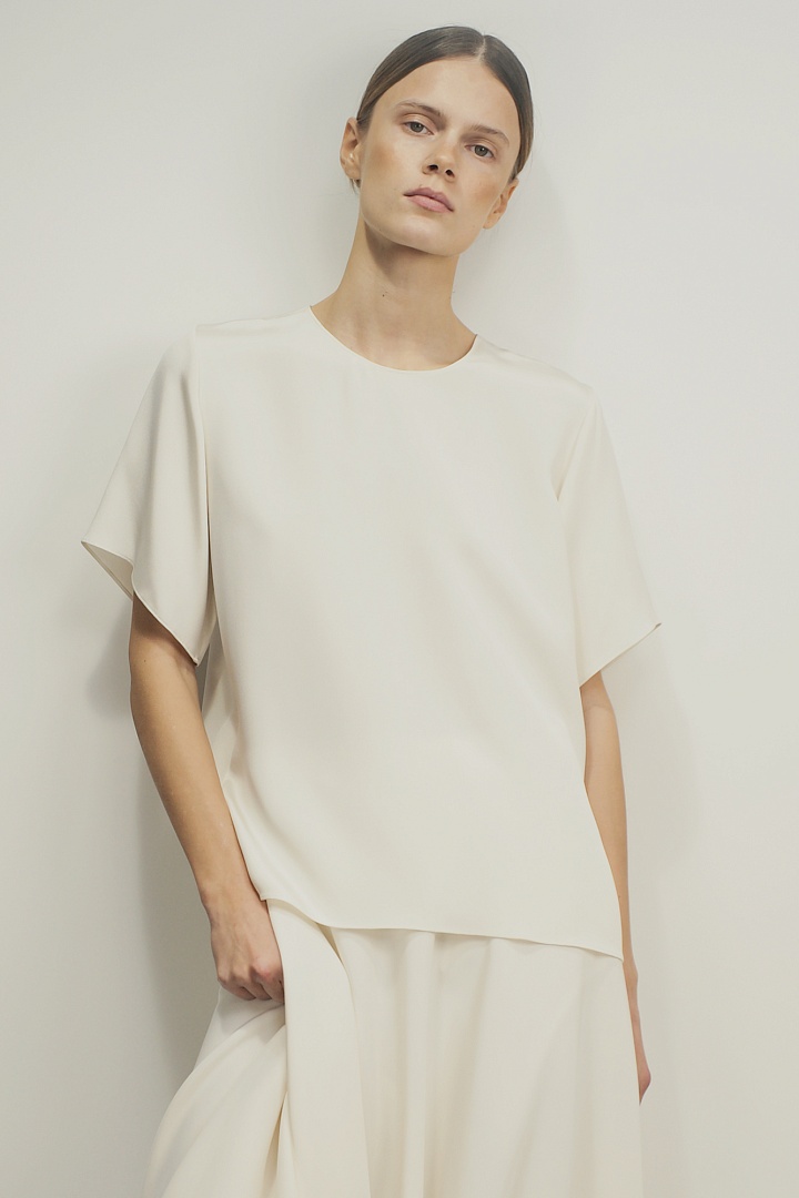 Футболка из плотного итальянского шелка кади с элегантной застежкой-пуговицей на спине. Свободный прямой крой со скругленной линией выреза.