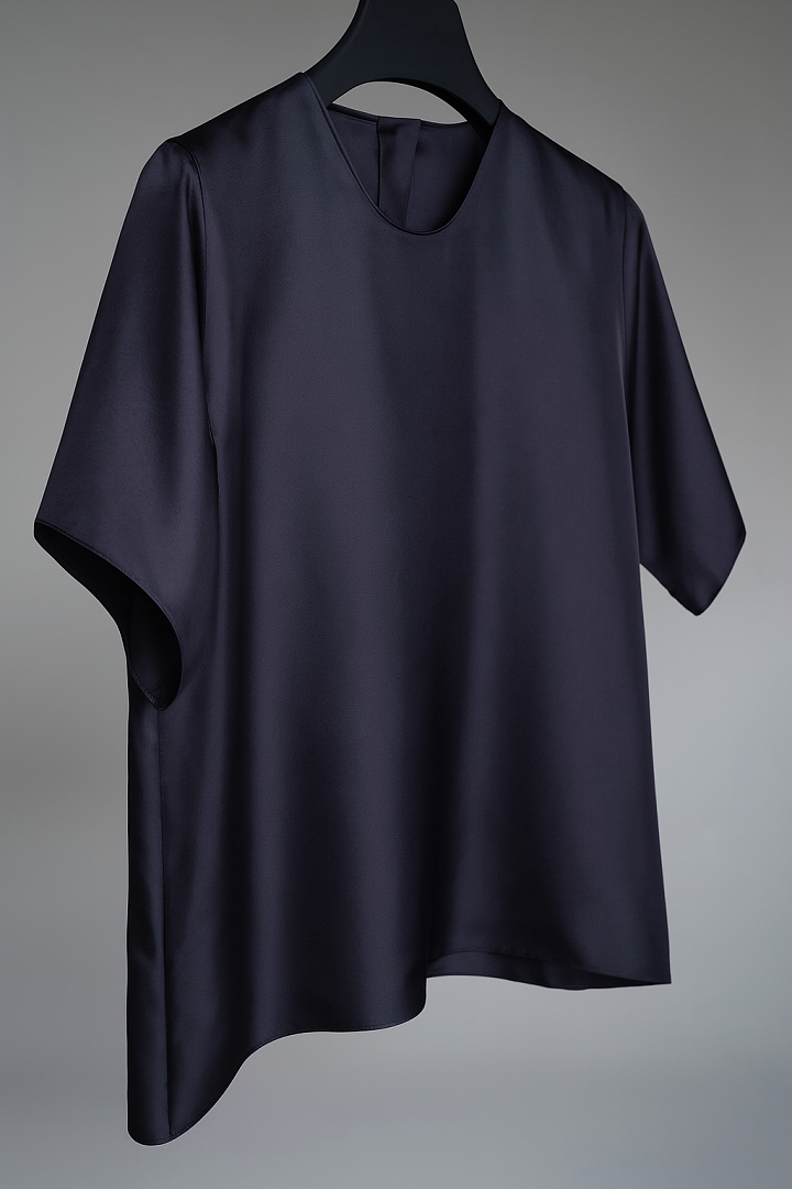 Футболка из шелка твил с элегантной застежкой-пуговицей на спине. Свободный прямой крой со скругленной линией выреза. Изделие является частью капсульной коллекции из шелка твил.