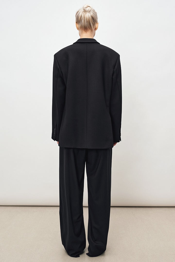 Брюки свободного кроя на молнии с двойными складками спереди и боковыми врезными карманами. Брюки выполнены из гладкой итальянской шерсти.