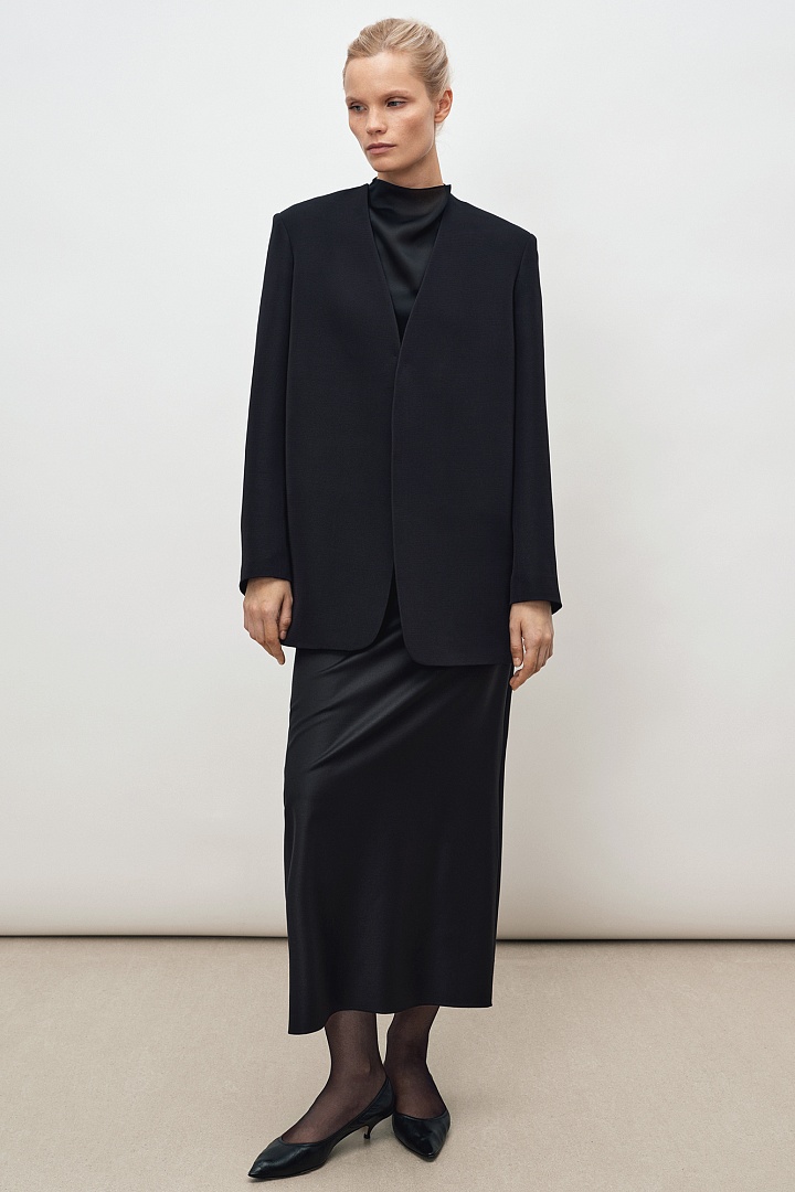 Юбка из гладкой костюмной шерсти в длине миди. С внутренней стороны сзади на поясе вшита резинка. Разрез сзади по центру до колена.