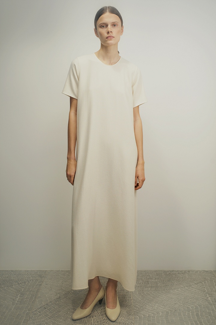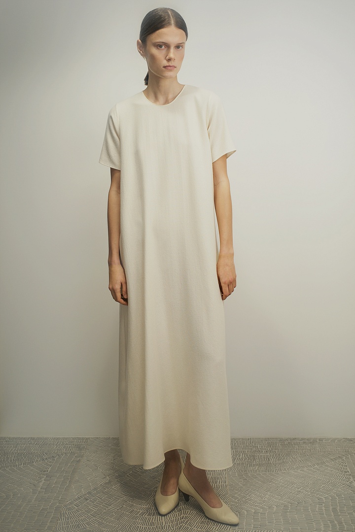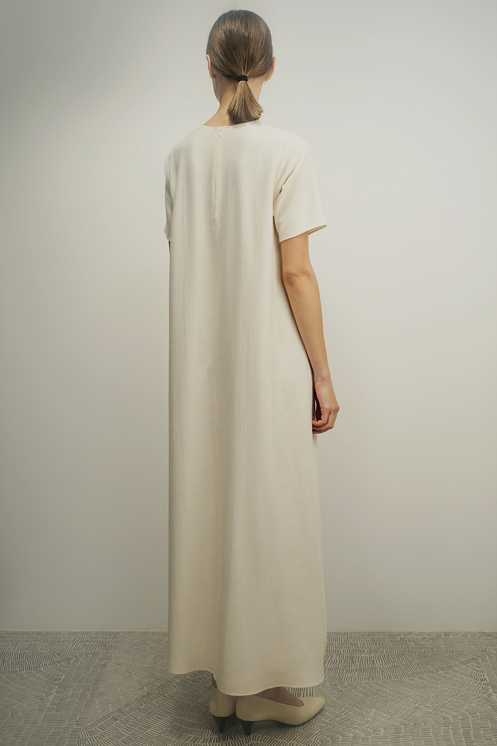 Фактурное платье А-силуэта в длине миди в сливочном оттенке. Лаконичный крой дополнен скрытой молнией на спине. Изделие выполнено из смеси органического хлопка, мягкого кашемира и шелка, создавая тактильно приятные ощущения.