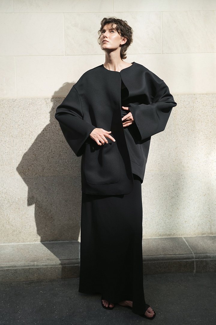 Вечерний жакет объемного силуэта с накладными карманами на шелковой подкладке в черном цвете. Модель выполнена из необычного, слегка ребристого полуматового шелка. Эксклюзивное изделие ручной работы.