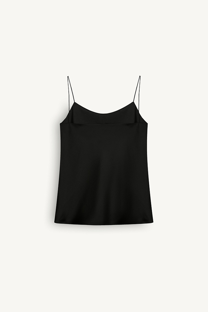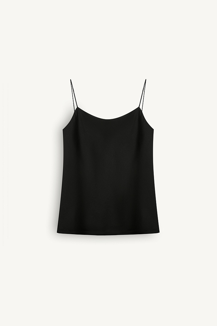 Двухслойный топ из шелкового твила на тонких бретелях в черном цвете.