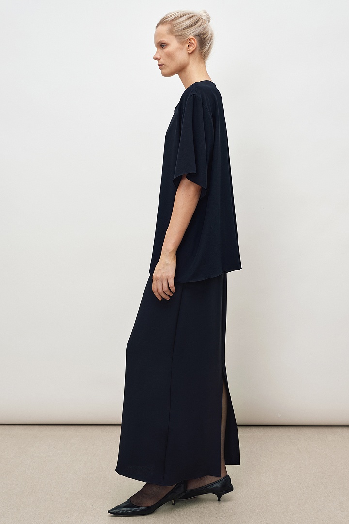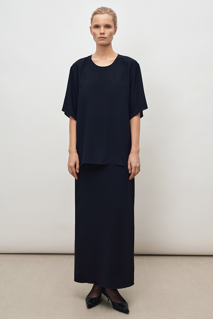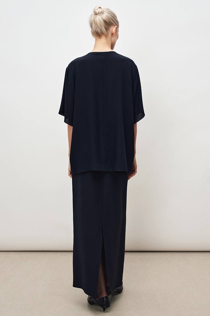Футболка прямого силуэта из темно-синего матового шелка.