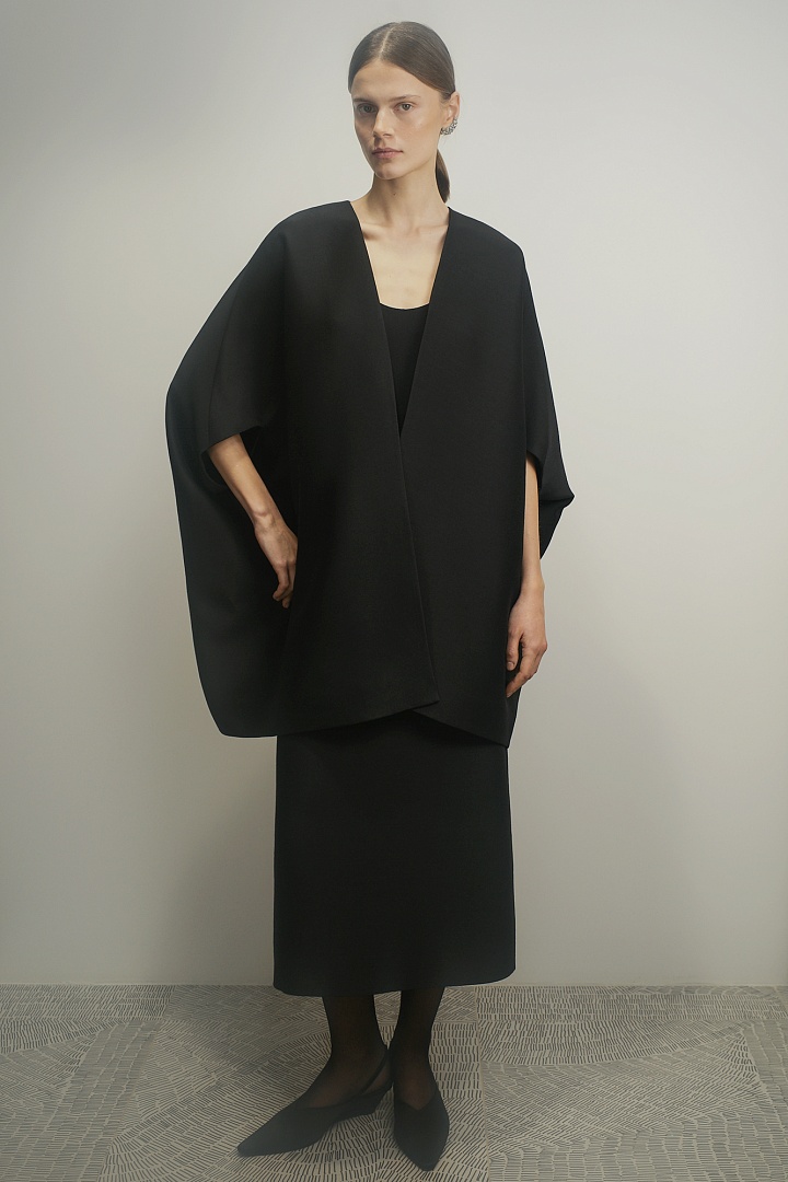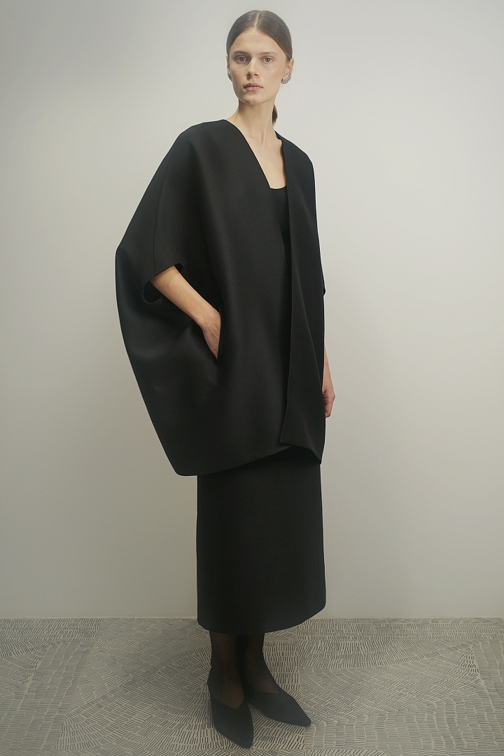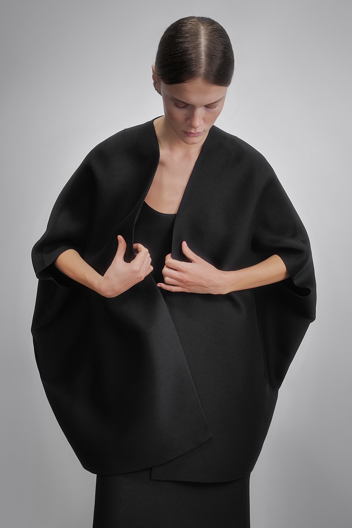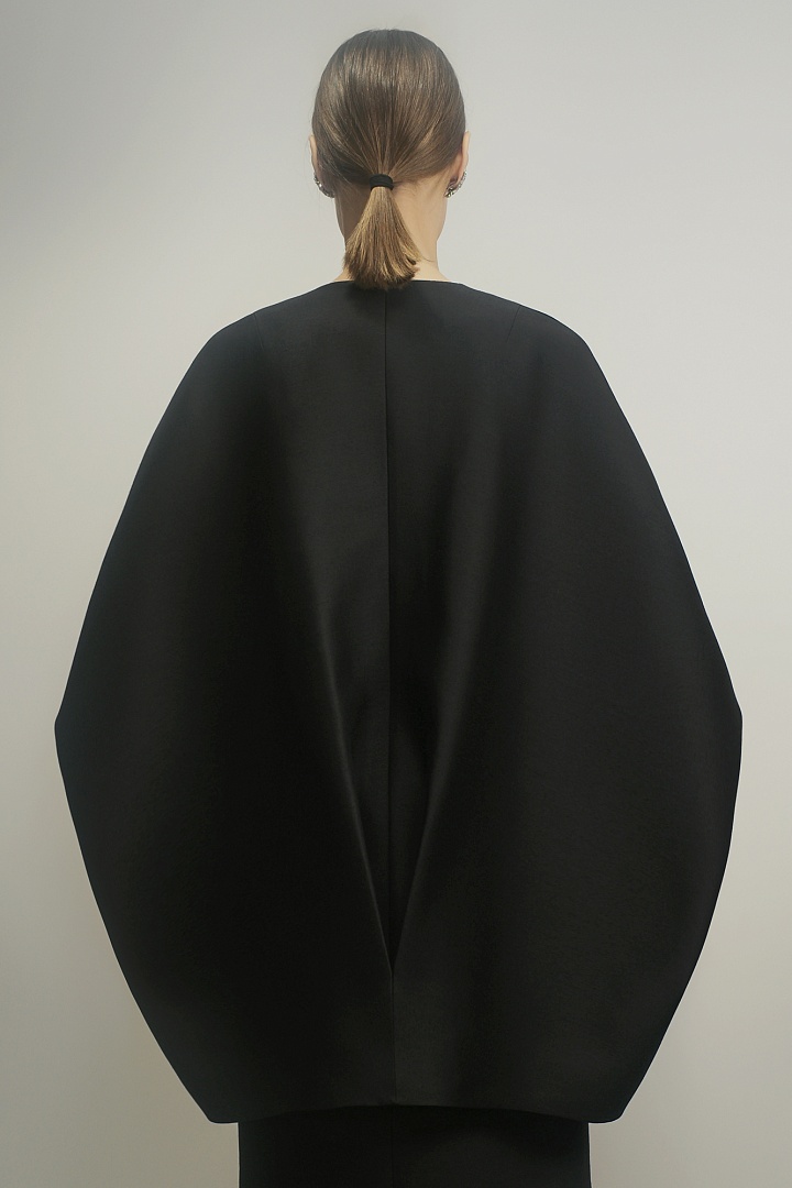 Объёмные рукава с горизонтальными прорезями для рук — тонкая цитата архивных конструкций, переосмысленная в современном минималистичном ключе.