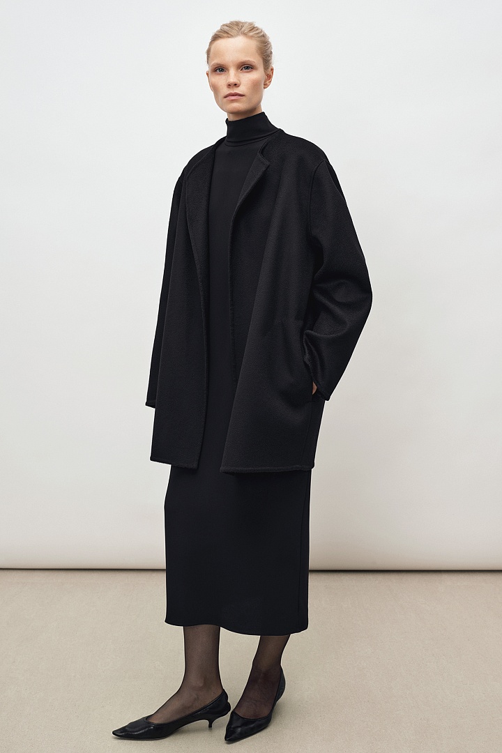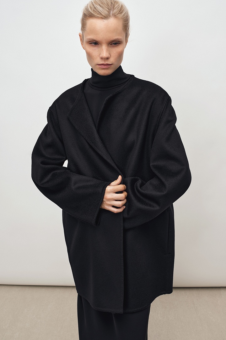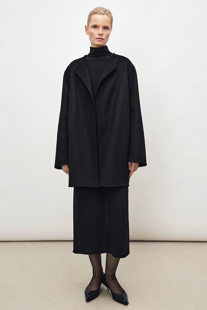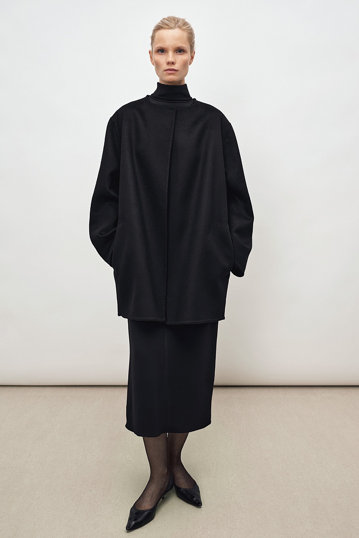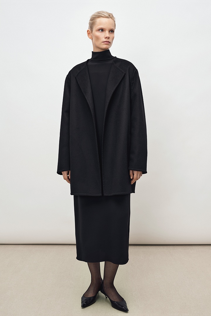 Жакет прямого кроя из двустороннего мягкого кашемира в черном цвете. Круглая горловина, карманы в боковых швах. Ручная работа, изделие выполнено без подкладки.