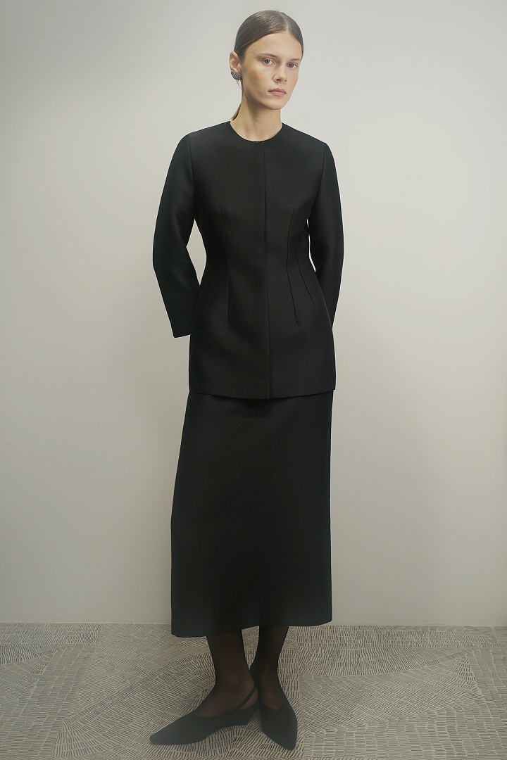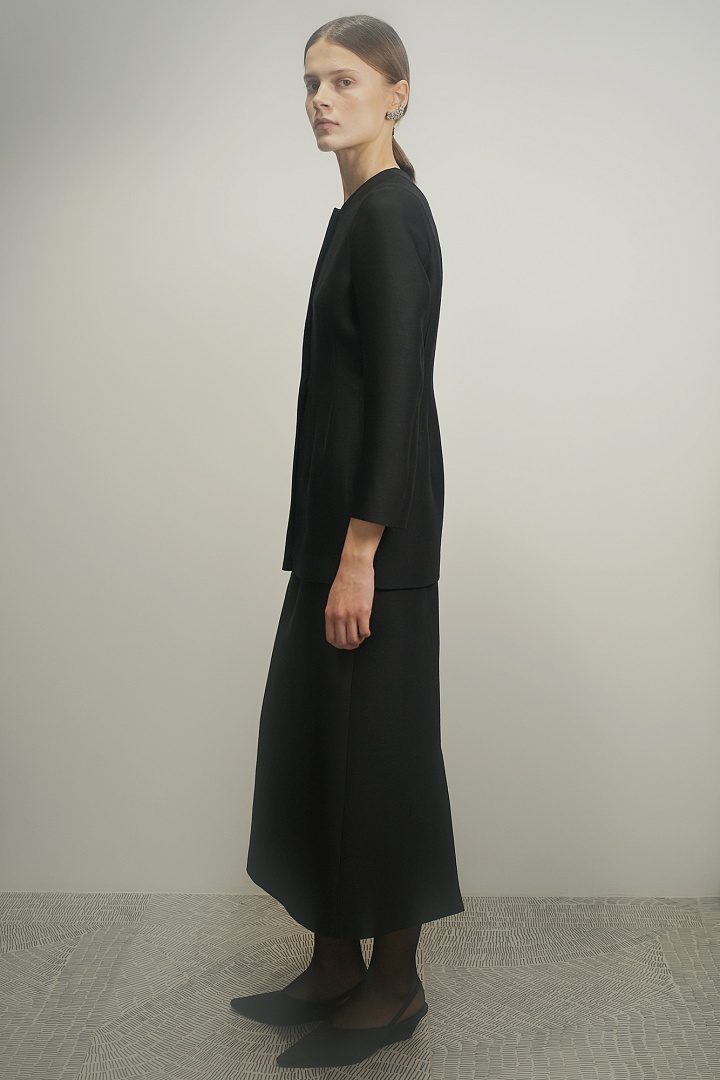 Графичный жакет приталенного силуэта из шелка с добавлением шерсти, на шелковой подкладке. Минималистичный дизайн подчёркнут рукавами 3/4 и скрытой застёжкой на крючках. Формодержащая ткань сохраняет чёткость линий и чистоту силуэта.