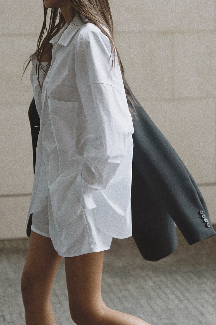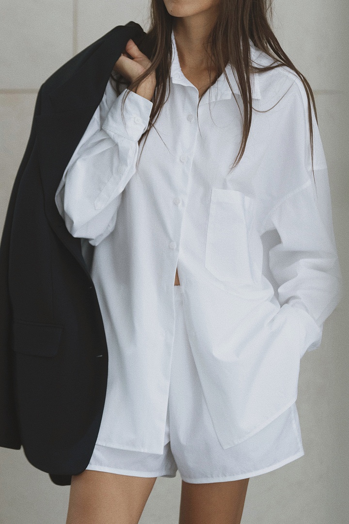 Рубашка свободного прямого кроя из хлопка с карманом в белом цвете.