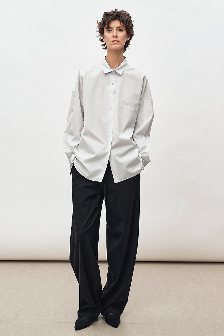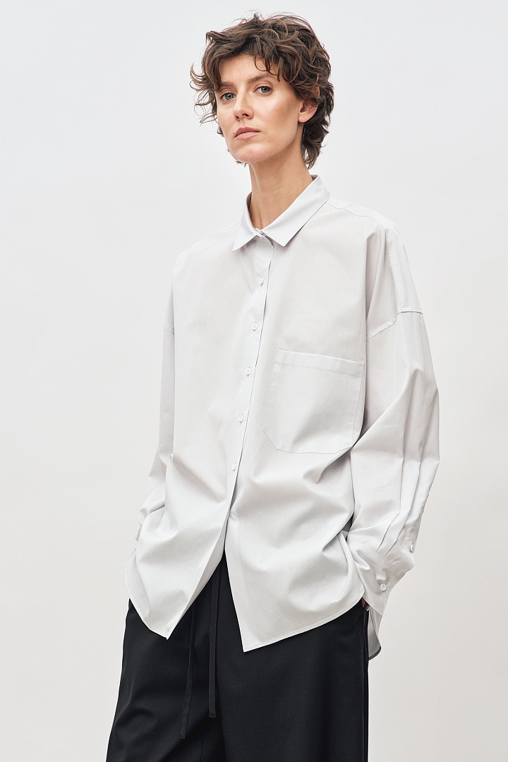 Рубашка свободного кроя из хлопка c накладным карманом в небесно-голубом оттенке. Слегка объемный прямой силуэт, заимствованный из мужского гардероба, спущенная линия плеча, скругленная линия низа. Модель, которую мы повторяем из сезона в сезон, можно носить как с костюмными брюками, так и с расслабленными джинсами.