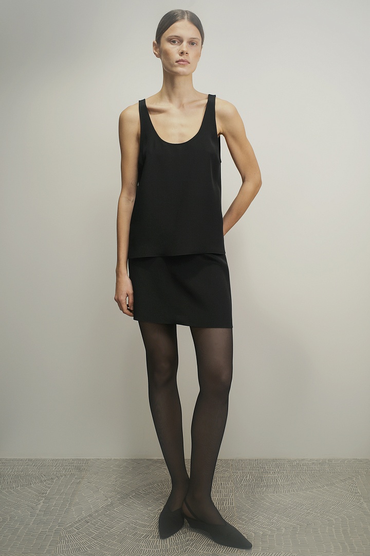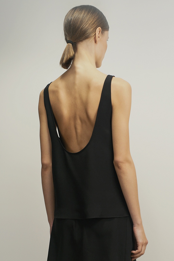 Топ-майка из матового шелка в черном цвете. Зауженные лямки, свободный силуэт, глубокий вырез на спине.