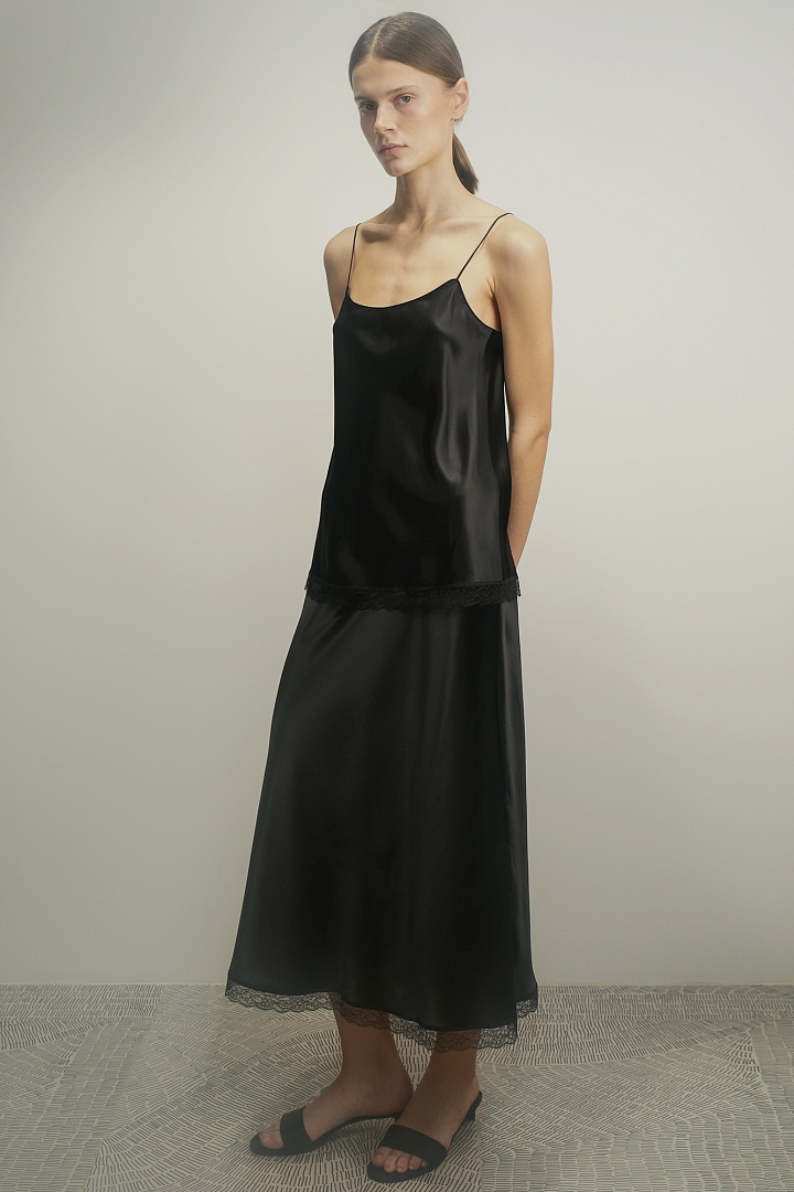 Юбка, скроенная по косой, из атласного шелка на резинке в черном цвете. Деликатное французское кружево выступает тонким акцентом, подчеркивая изящество линии. Модель легко интегрируется в гардероб — от вечерних комплектов до спокойных повседневных сочетаний. Юбка является частью комплекта с топом Soleia.